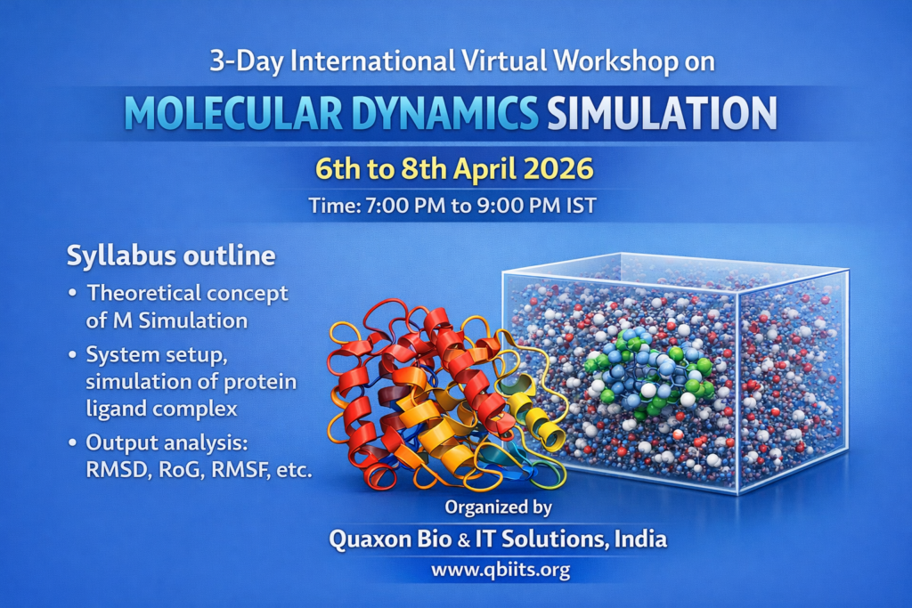 Quaxon Bio & IT Solutions, is going to conduct it’s 73rd international virtual workshop cum Faculty Development Program on “Molecular Dynamics Simulation in Bioscience Research ” scheduled to held from 6th to 8th April 2026 globally at Indian Standard Time 7.00 PM