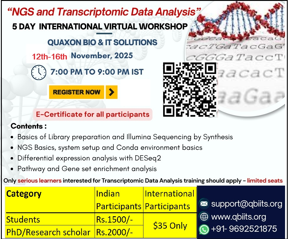 Quaxon Bio & IT Solutions, India is conducting a Five day virtual workshop (66th International virtual workshop) on “NGS and Transcriptomic Data Analysis from Rescheduled to 12-16 Nov 2025
